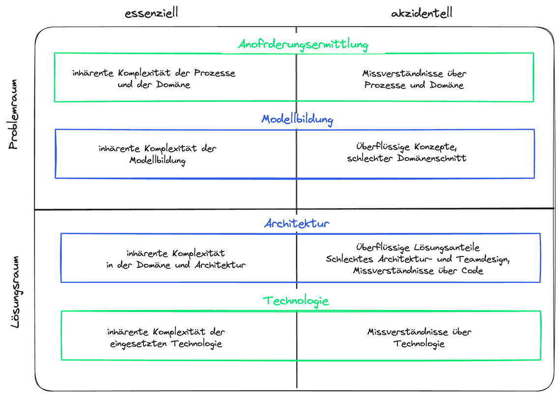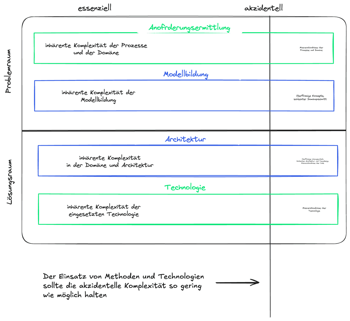 - Essentielle Komplexität ist die Komplexität, die dem eigentlichen Problem innewohnt. Sie gehört zur Domäne, zum Prozess oder zur Geschäftstätigkeit. Diese Komplexität können und sollen wir nicht wegrationalisieren – sie ist Teil der Wertschöpfung.