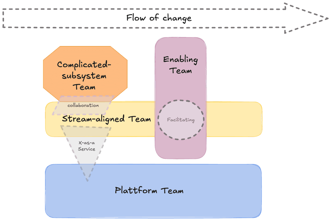 - Stream-Aligned Teams sind das Herzstück: Sie sind entlang eines fachlichen oder wertschöpfenden Flusses ausgerichtet – z.B. eines Prozesses – und sollen möglichst autonom agieren können. Sie tragen Verantwortung von der Anforderung bis zum Betrieb.