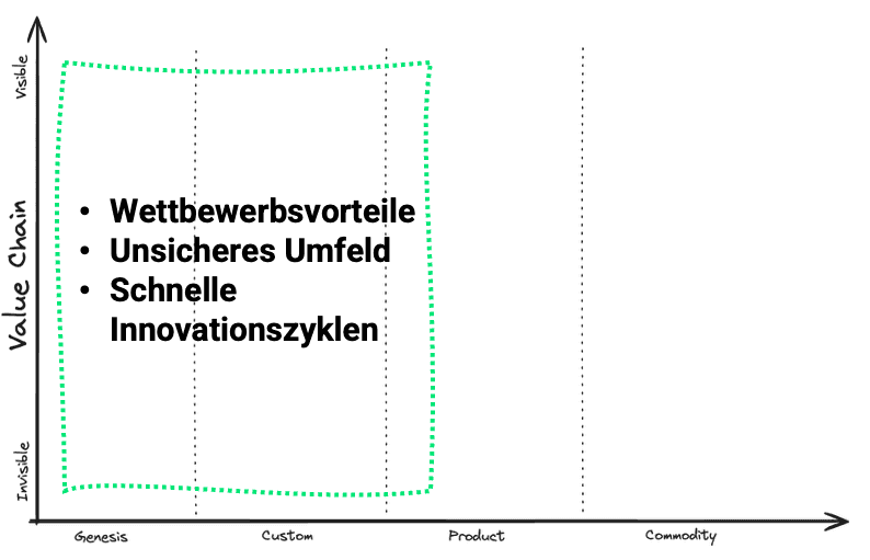 - Die X-Achse beschreibt den Reifegrad der Komponente – von Genesis (etwas völlig Neues) über Custom (maßgeschneiderte Lösung), Product (ein fertiges Produkt) bis zu Commodity (eine standardisierte und austauschbare Komponente).