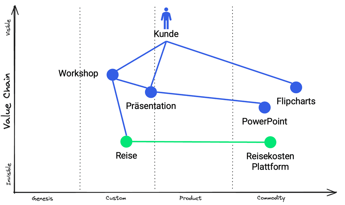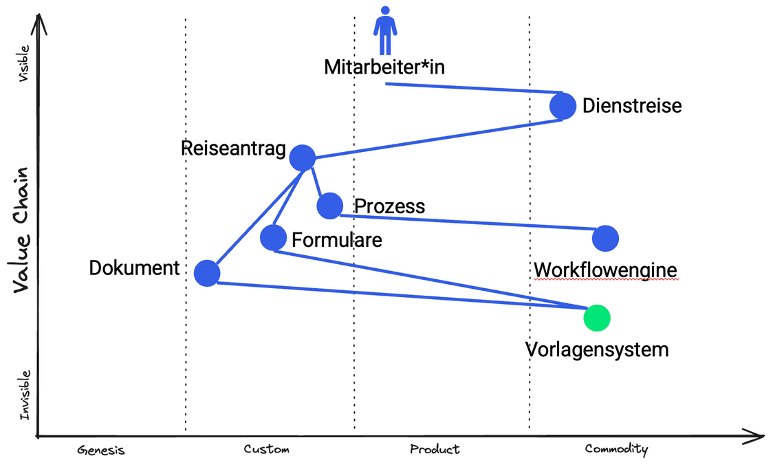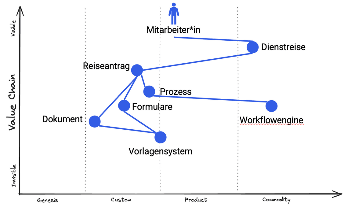 Genau hier zeigt Wardley Mapping seinen Wert. Auf der Map lässt sich klar erkennen: Ein Dienstreiseantrag ist ein Prozess mit sehr niedriger Kunden-Sichtbarkeit und hohem Reifegrad – also Commodity. Auch das Formulardesign für diesen Anwendungsfall gehört in denselben Bereich. Der Markt bietet unzählige ausgereifte und kostengünstige Lösungen – warum also selbst entwickeln?