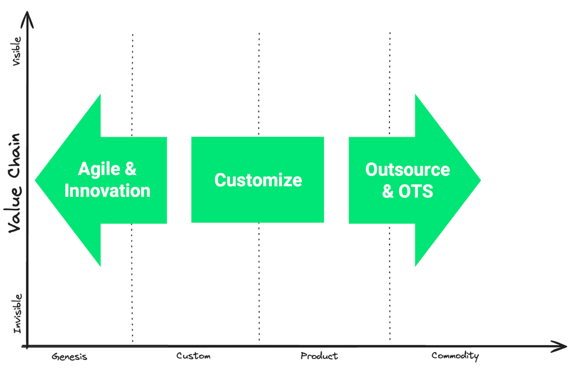 - Genesis und Custom: Hier seid ihr im Innovationsbereich. Es geht um neue, noch unausgereifte oder stark an eure Organisation angepasste Lösungen. Diese Komponenten sind eng mit eurer Strategie verbunden – hier braucht ihr Teams, die eure Fachlichkeit verstehen, eng mit euren Stakeholdern arbeiten und schnell reagieren können.