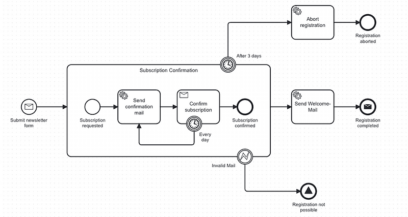 Hand aufs Herz – die Arbeit mit Prozess-Engines verläuft selten so problemlos, wie man es sich wünscht. Stell dir vor, du wirst beauftragt, einen Newsletter-Abo-Prozess zu automatisieren. In aller Regel startest du damit, das Prozessmodell in BPMN zu entwerfen: Ein Nutzer füllt ein Formular aus, erhält eine Bestätigungs-E-Mail, bestätigt sein Abonnement und bekommt schließlich eine Willkommensmail. Sobald der grundlegende Ablauf steht, verfeinerst du das Modell, um Ausnahmen und zusätzliche Szenarien zu berücksichtigen.